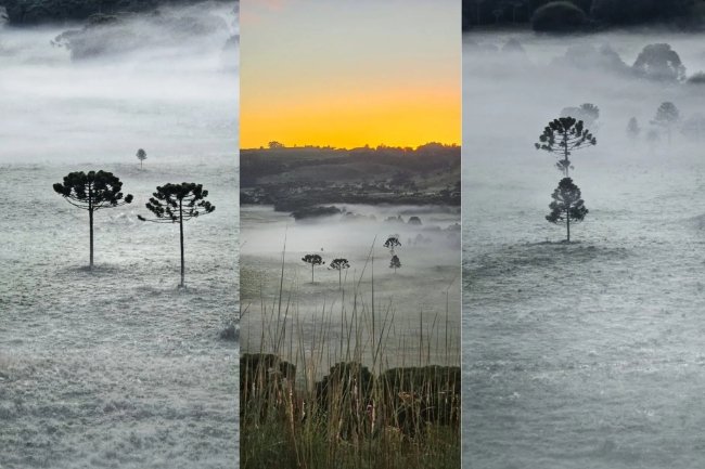 Na manhã de domingo, a paisagem estava envolta em uma camada de geada na região do Vale dos Caminhos da Neve, localizada no município de São Joaquim, na área do Planalto Sul de Santa Catarina.